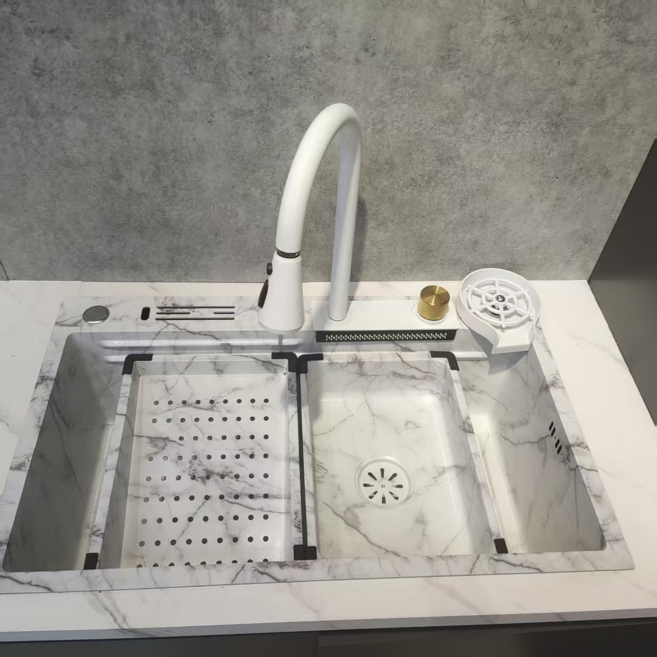 | سینک آشپزخانه دو لگنه با شیر آب قوس دار بالا | 900×550×230mm | خروجی آب با زاویه بزرگ |